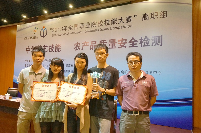 由教育部、中华全国供销合作总社等23个部门(机构)共同举办的“2013年全国职业院校技能大赛”高职组农产品质量安全检测竞赛,于6月6日至9日在浙江经贸职业技术学院举行。我系食品营养与检测专业3名学生代表广东省参加蔬菜中有机磷类农药残留的检测、畜禽肉中氟喹酮类兽药残留的检测、茶叶中重金属含量的检测等3个比赛项目,陈思敏、张阳梅同学分获一等奖和三等奖。