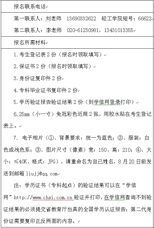 咨询地址:广州海珠区新港西路152号广东轻工职业技术学院工业实训中心A502食品与生物工程系或广州天河五山华南理工大学校园内北区继续教育学院大楼一楼招生管理办公室